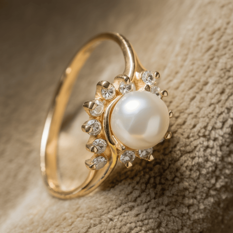 A pérola, símbolo de pureza e beleza atemporal, ocupa o centro do palco. A sua suavidade irradia um brilho suave, enquanto a sua presença delicada adiciona uma nota de refinamento à peça. A pérola é escolhida pela sua perfeição natural e representa a simplicidade e a elegância clássica.