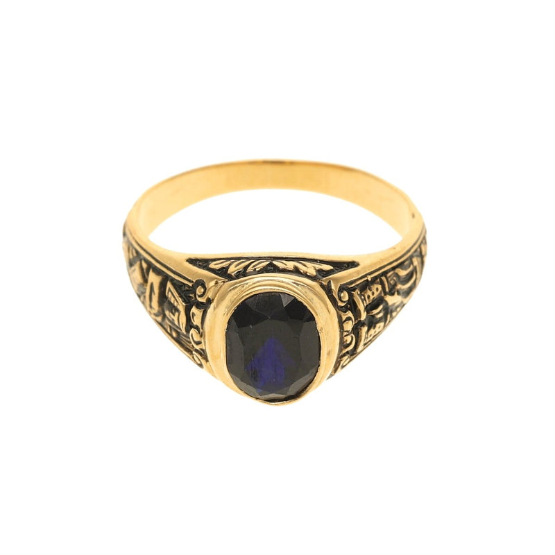 Anel de Curso em Ouro de 19.2kl com Safira Australiana, e aro adornado de motivos náuticos, com acabamento em esmalte preto
