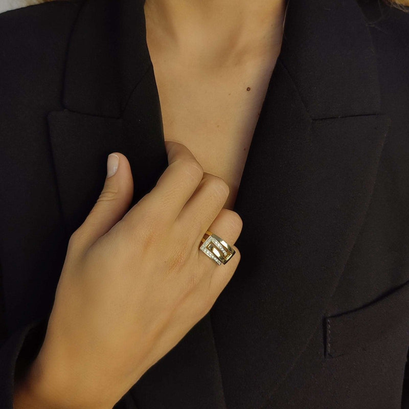 O contraste entre o ouro branco e o ouro amarelo adiciona dimensão e interesse visual ao anel, criando uma paleta de cores rica e deslumbrante. Os diamantes, cravejados de maneira elegante na superfície do anel, proporcionam um brilho extraordinário e um toque de glamour.