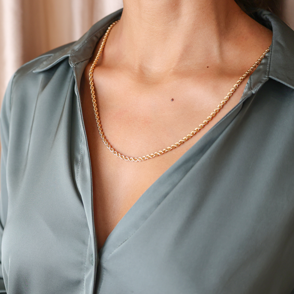 Em ouro de lei de 19,2kl, este Fio de ouro com Malha Corda é perfeito para quem procura uma joia elegante e versátil. A sua beleza está na sua essência minimalista e intemporal que o torna o complemento perfeito para o uso diário ou para um visual mais formal.