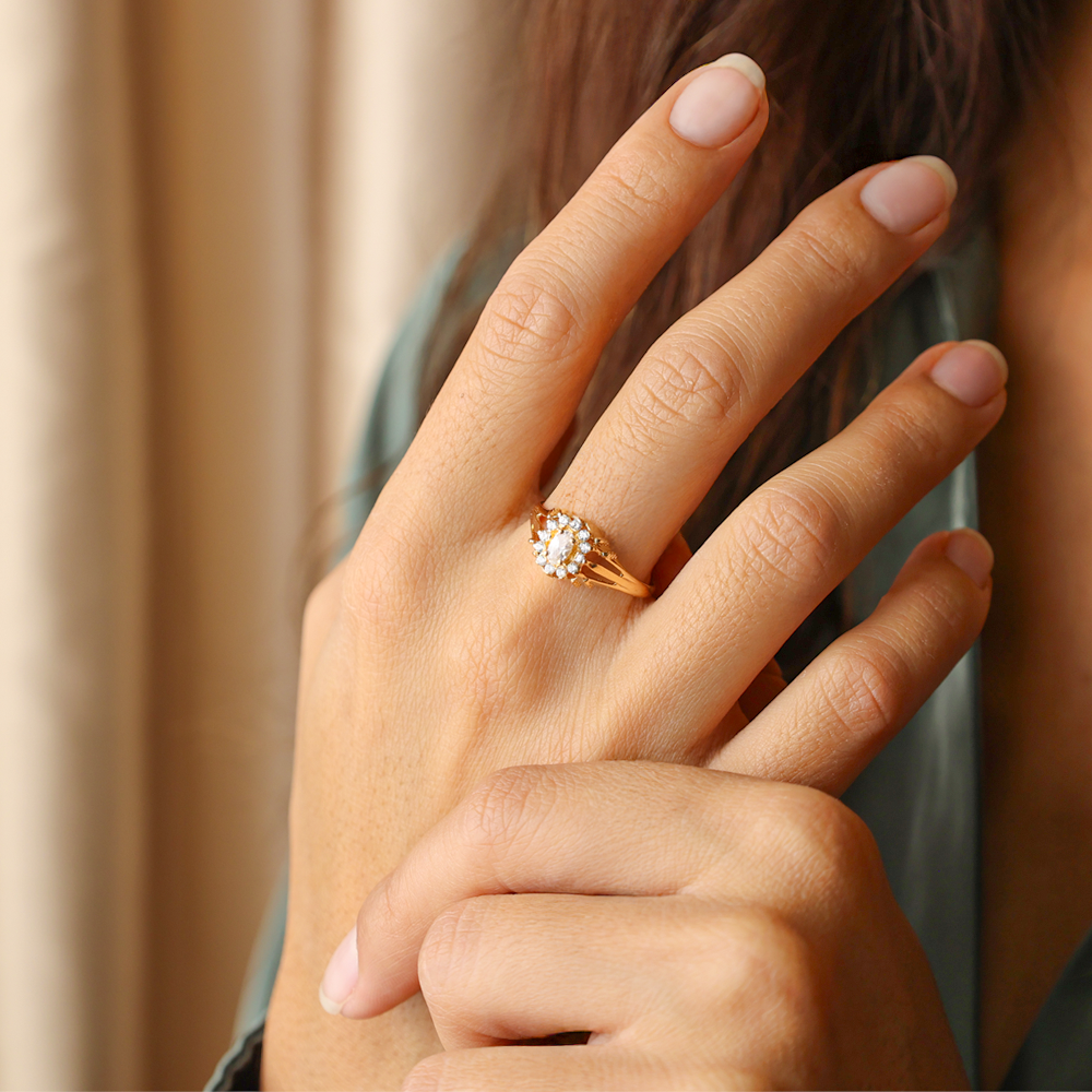 Este anel chuveiro com aro trabalhado e zircónias é ideal para quem procura tradição com um toque de originalidade. Uma joia marcante, pensada para brilhar em ocasiões únicas e para ser guardada como peça intemporal, que combina movimento, detalhe e sofisticação em cada ângulo.