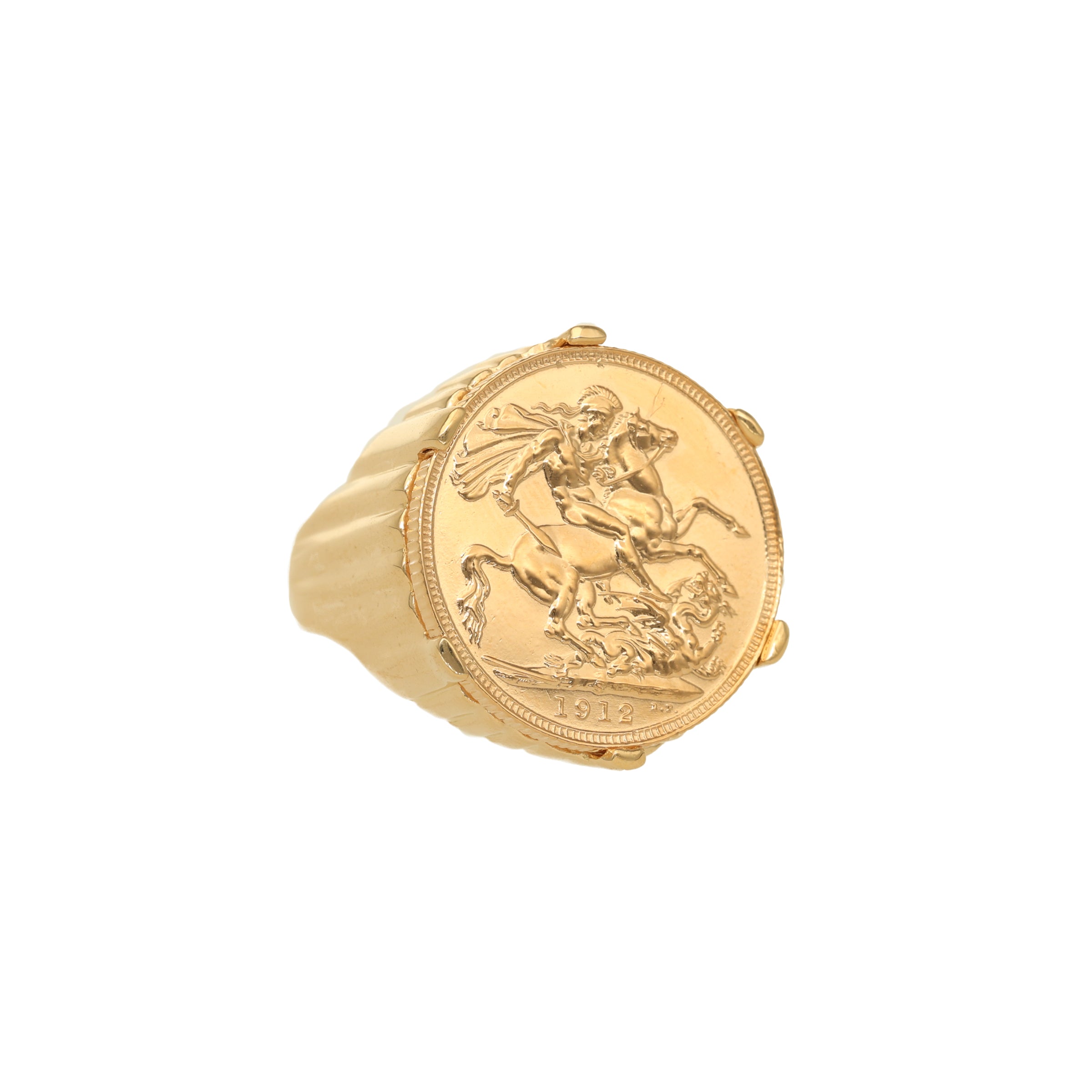Anel de Homem em Ouro Amarelo (19,2kl) adornado com Libra Rei Jorge V em Ouro de 22kl, datada de 1912 , com S. Jorge no Verso