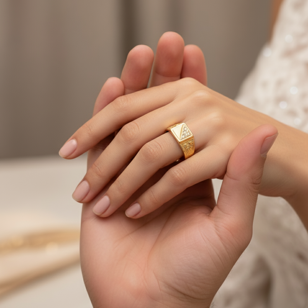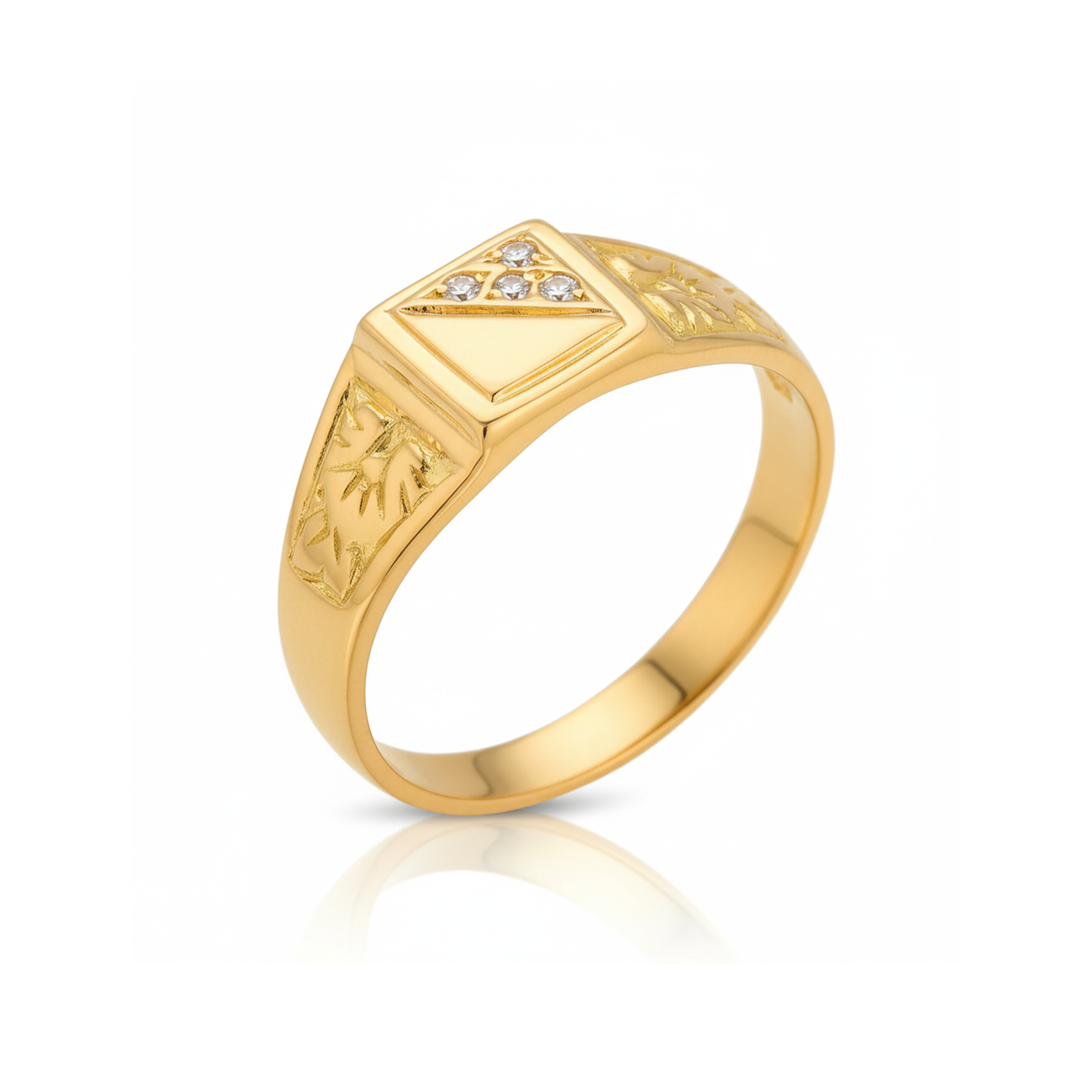 O Anel de Mesa em Ouro 19kl com Motivos Florais e Zircónias é uma joia imponente e elegante, que combina tradição com um toque de modernidade. Nas laterais da mesa, delicados motivos florais em relevo dão vida ao design, evocando a beleza da natureza e o cuidado artesanal. No topo, a mesa é parcialmente cravejada com zircónias brilhantes, que ocupam metade da superfície e criam um contraste sofisticado entre o ouro polido e o brilho intenso das pedras.