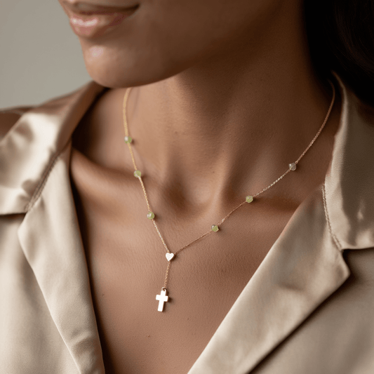 Fio com Cruz, Coração em Ouro 19kl e Pedras Verdes (40cm)