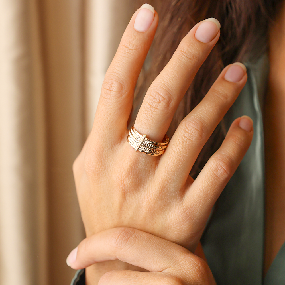 Anel Sete Escravas em Ouro de 19kl com efeito lapidado nos Aros