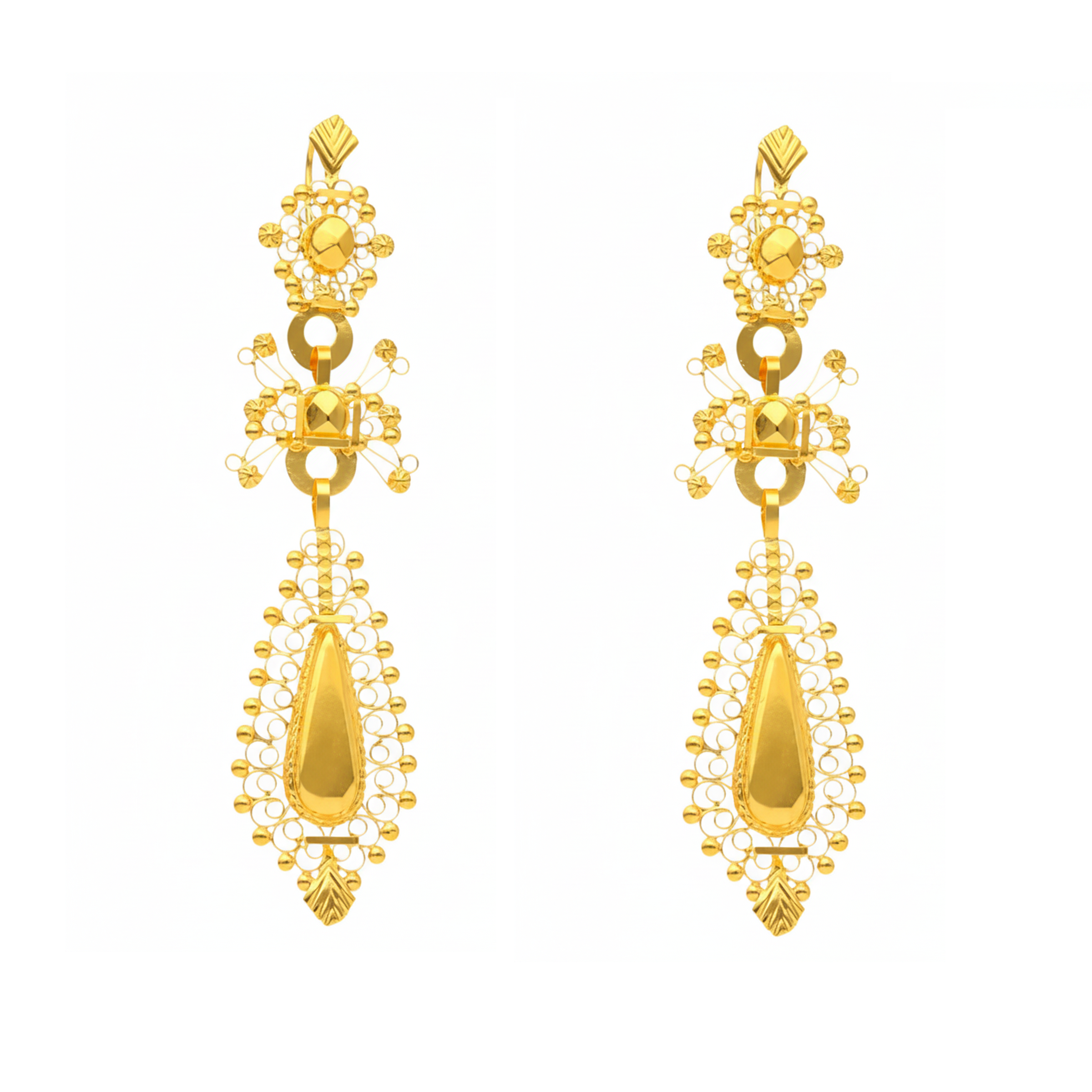 Estes brincos compridos marquesa são perfeitos para ocasiões especiais, em que cada detalhe faz a diferença. O trabalho artesanal, aliado ao brilho do ouro, transforma-os numa peça marcante e intemporal, ideal para quem gosta de joias com identidade e significado. Uma criação única que alia tradição, delicadeza e a beleza da natureza num só acessório.