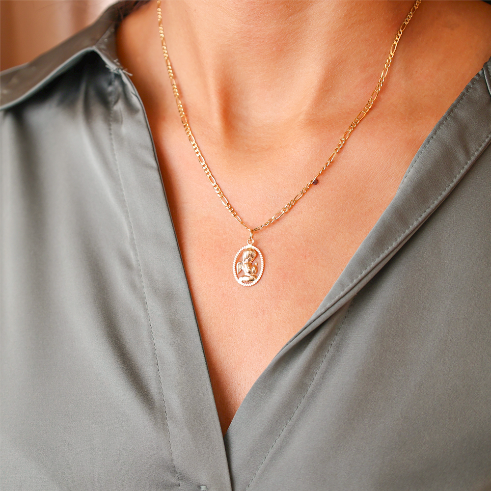 O anjo da guarda é frequentemente associado à ideia de proteção e orientação divina. Esta medalha, feita em ouro, confere à peça um brilho luxuoso e duradouro. O aro adiciona um toque de detalhe e sofisticação ao redor da medalha.
