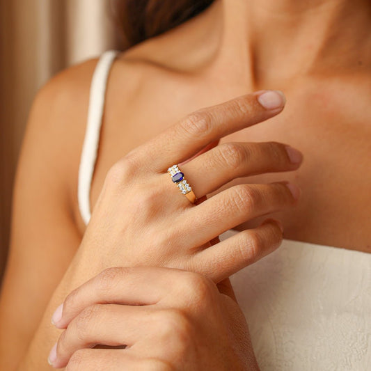 Anel Chuveiro em Ouro 19kl com Safira e Zircónias (T14)