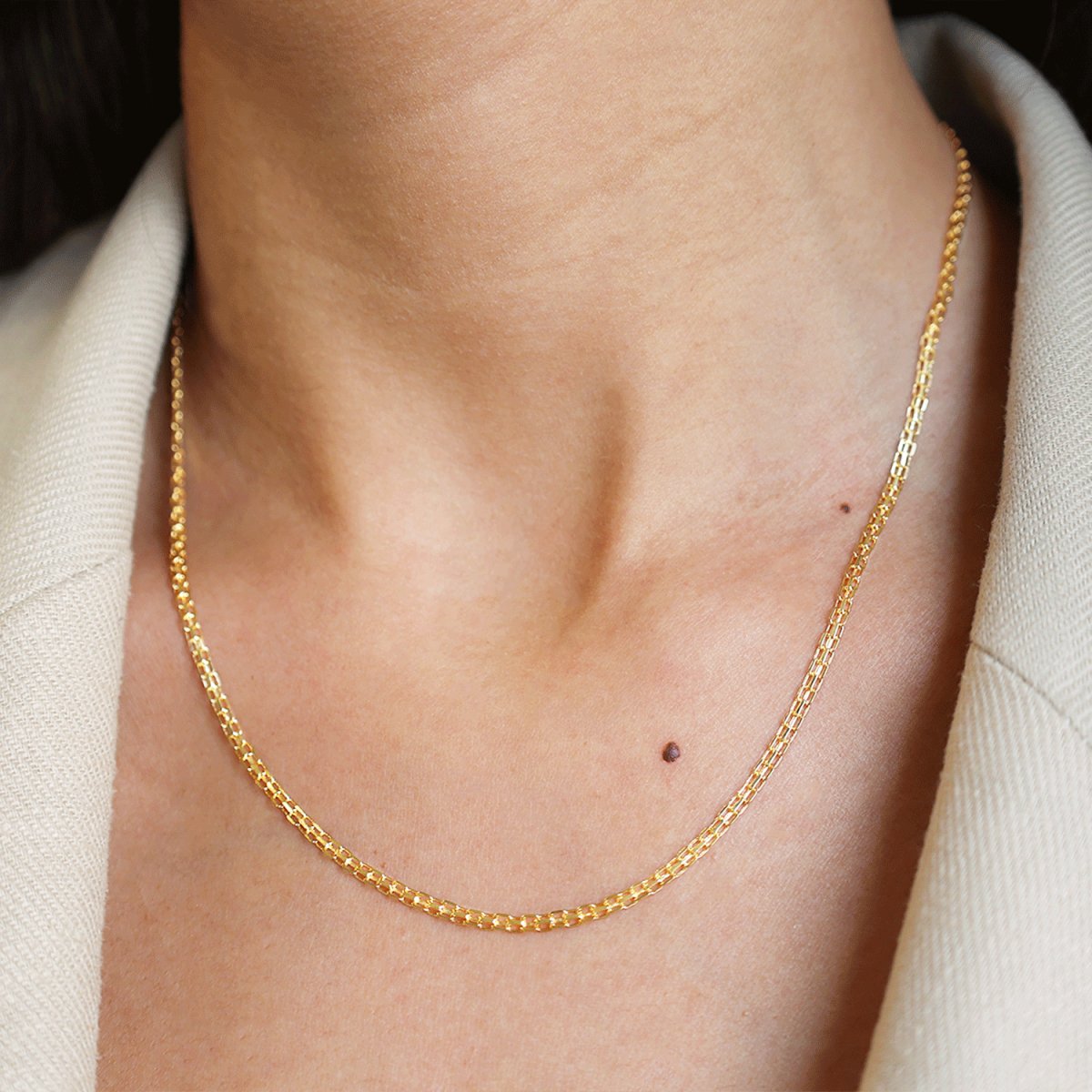 O Fio Malha Batida em Ouro de 19.2kl é uma escolha versátil e atemporal que se adequa a todas as idades. A sua malha batida confere-lhe uma textura elegante e uma aparência sofisticada. A versatilidade desta peça permite que seja usada tanto de forma simples, realçando a beleza da malha batida, quanto com a adição de um pendente para um toque personalizado.