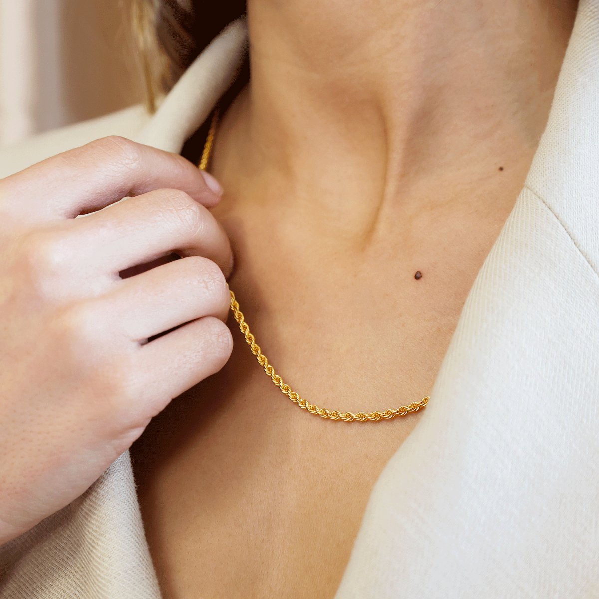 Em ouro de lei de 19,2kl, este Fio de ouro com Malha Corda é perfeito para quem procura uma joia elegante e versátil. A sua beleza está na sua essência minimalista e intemporal que o torna o complemento perfeito para o uso diário ou para um visual mais formal.