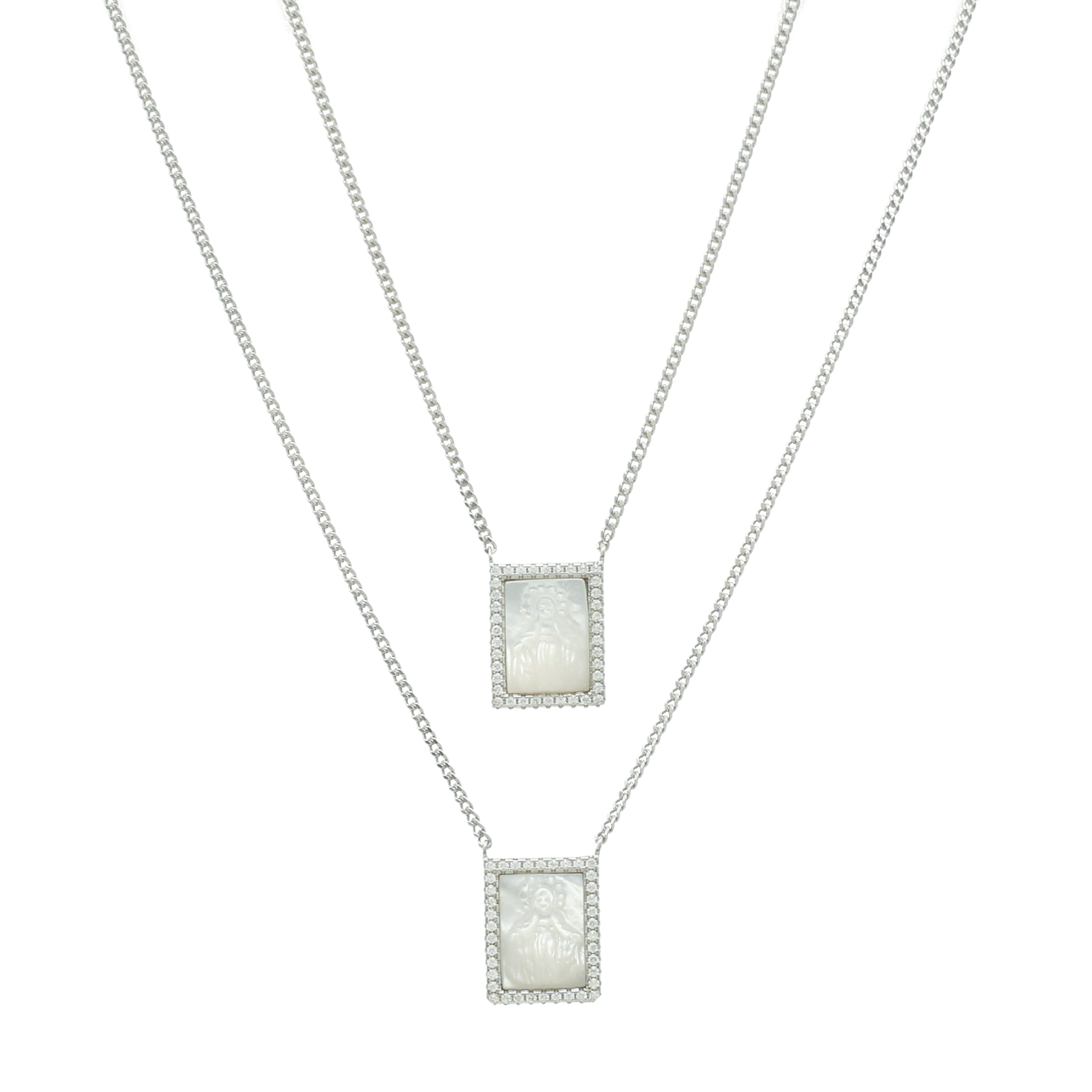 Mais do que uma joia, este escapulário em prata é um símbolo de devoção, proteção e fé inabalável. Com delicadas imagens religiosas em madrepérola, ele reflete a luz da espiritualidade e a pureza da conexão com o divino.