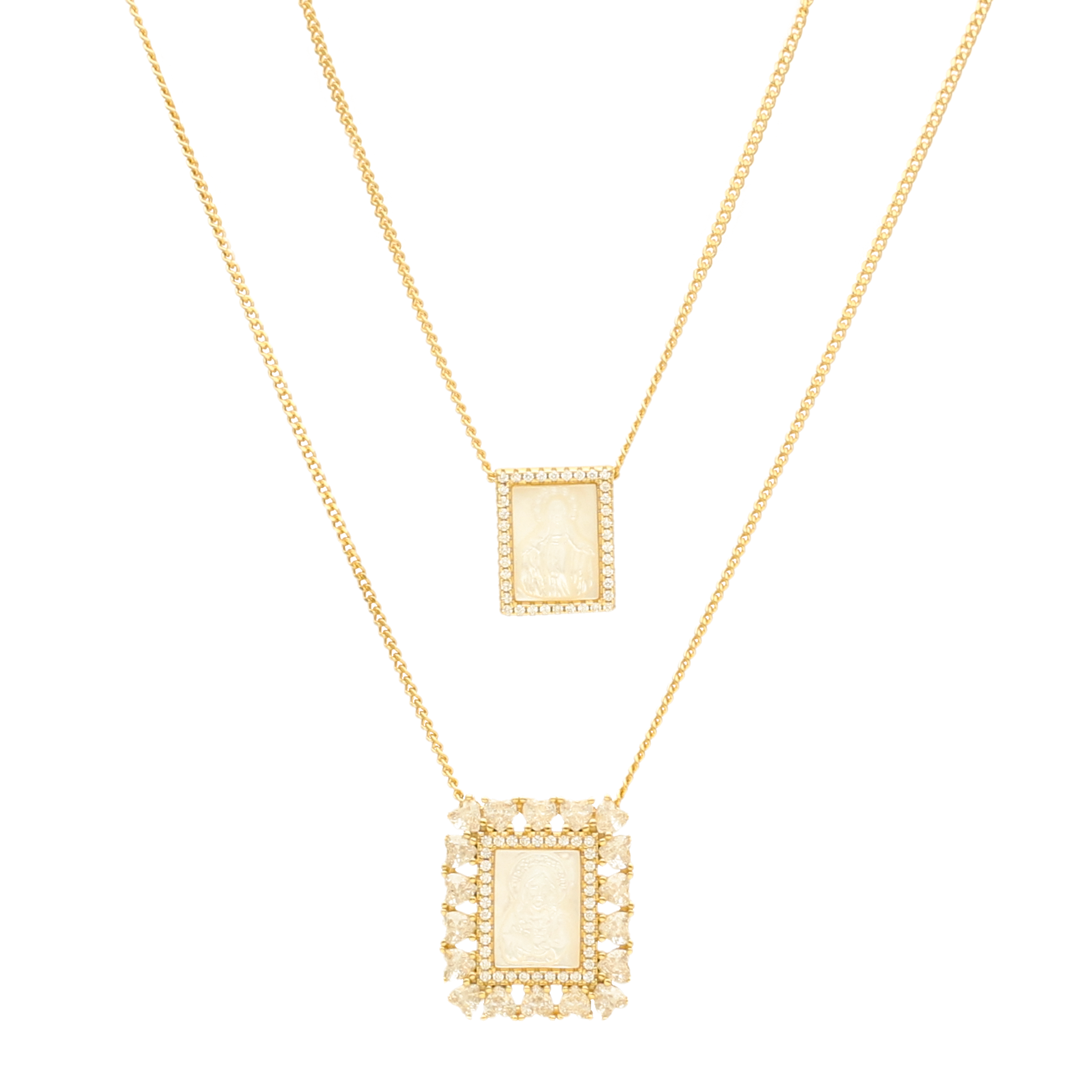 Escapulário em Prata Dourada com Imagem Religiosa em Madrepérola com Zircónias em Coração