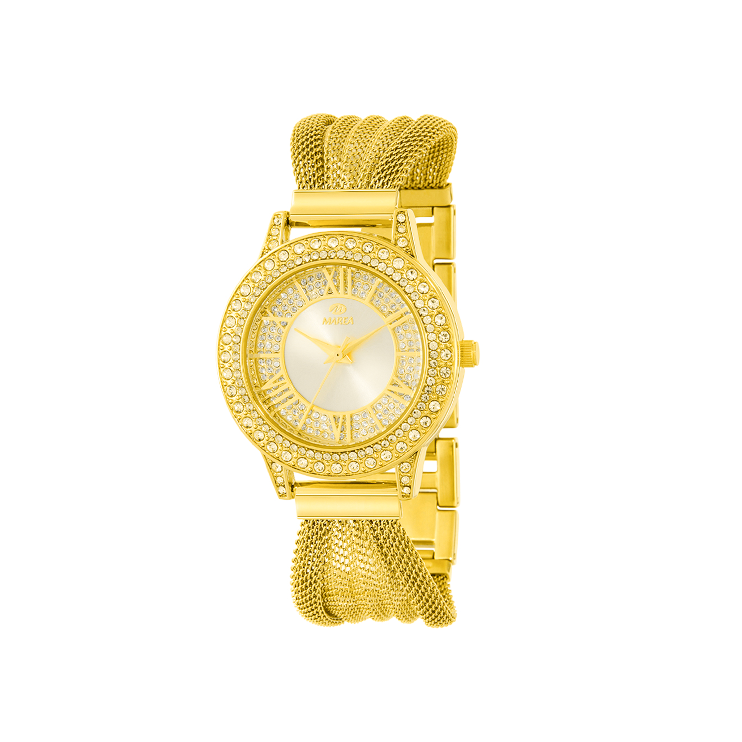 O Relógio Lumera é um relógio que brilha com a força e a elegância de uma verdadeira deusa. O seu design em aço dourado transmite luxo e sofisticação, enquanto a bracelete trabalhada, que se assemelha a uma pulseira, envolve o pulso com brilho e presença. O mostrador, inteiramente cravejado de brilhantes cintilantes, reflete a luz em cada movimento, criando um efeito deslumbrante que transforma o tempo num acessório de glamour.