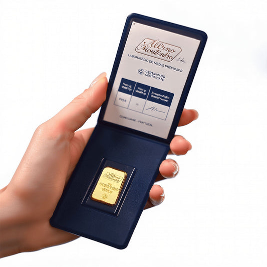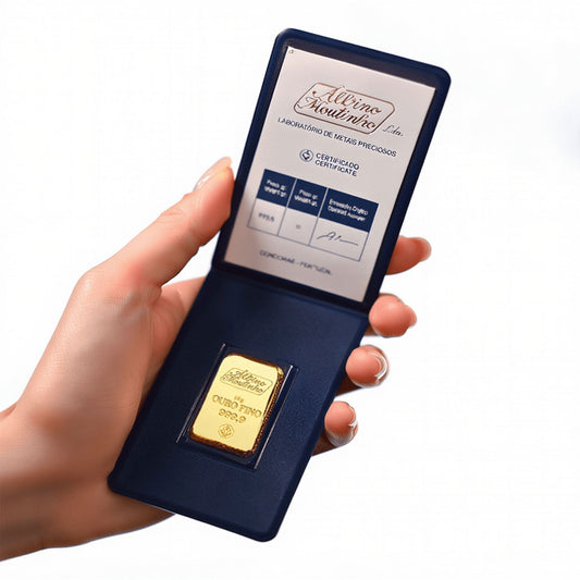 Barras de Ouro Albino Moutinho | Barras de ouro puro 24 quilates (999,9), com pesos de 2,5 g, 5 g e 10 g. Certificadas e fabricadas com excelência portuguesa, estas barras representam ouro de investimento seguro, ideal para quem valoriza património duradouro. Uma escolha perfeita para presentes de Natal, celebrações especiais ou diversificação financeira, unindo elegância, tradição e valor real que perdura no tempo.