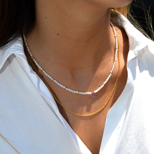 Colar com Pérolas e Pedra de Cor Roxa