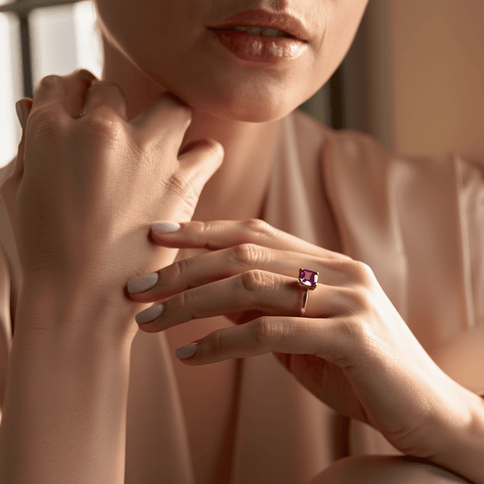 Anel Solitário em Ouro 19kl com Pedra Quadrada Roxa (T15)