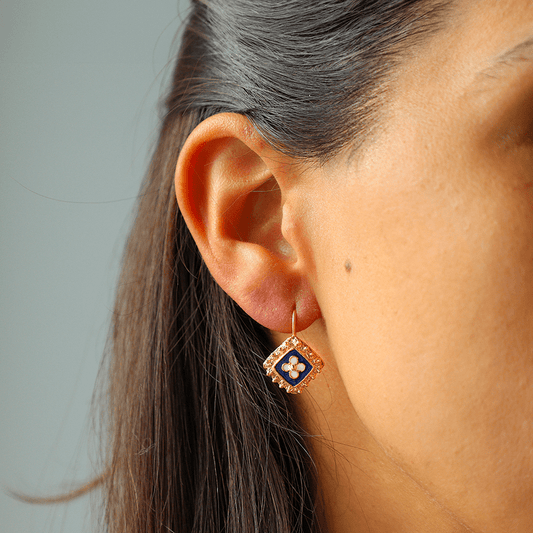 Brincos Tradição em Prata Dourada e Esmalte Azul e Branco
