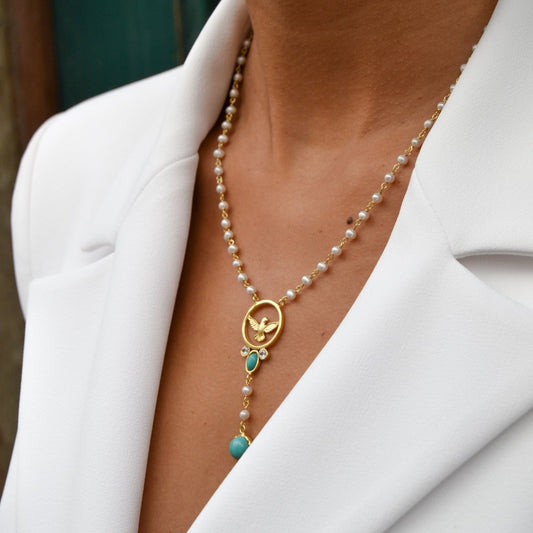 Fio Pomba em Prata Dourada com Perolas e Pedras Turquesa