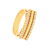 Este anel é uma joia sofisticada que combina brilho e modernidade num design harmonioso. A estrutura apresenta duas filas exteriores de zircónias cintilantes, cuidadosamente cravadas para máxima luminosidade, que enquadram uma fila central em ouro polido, criando um contraste elegante entre luz e metal.