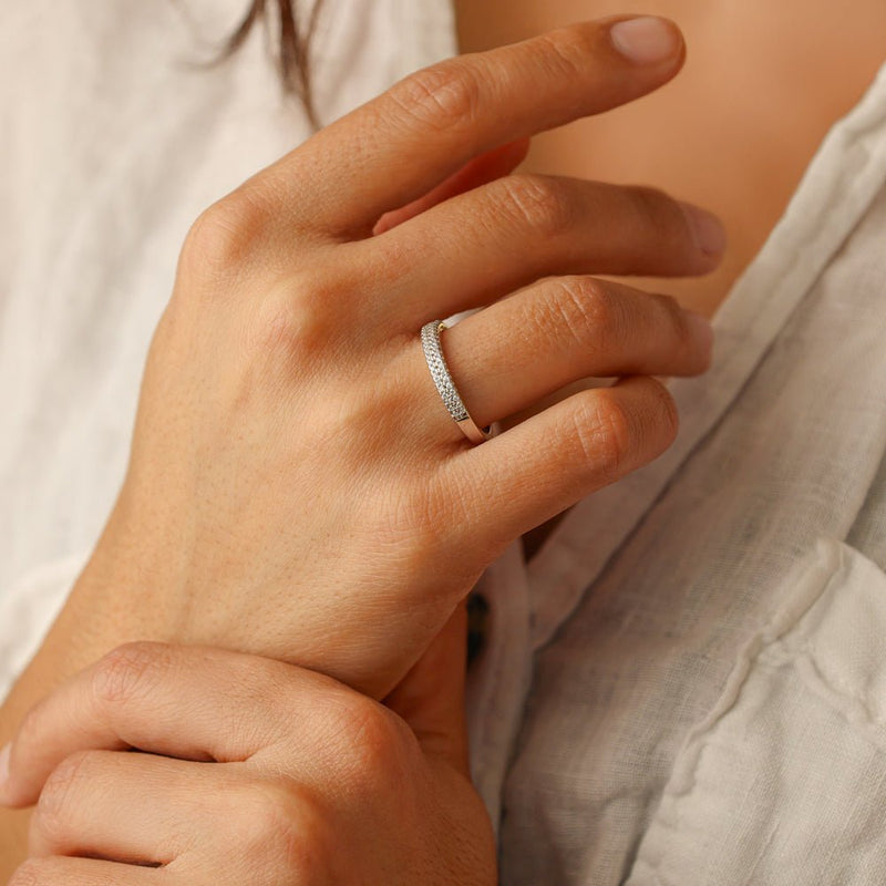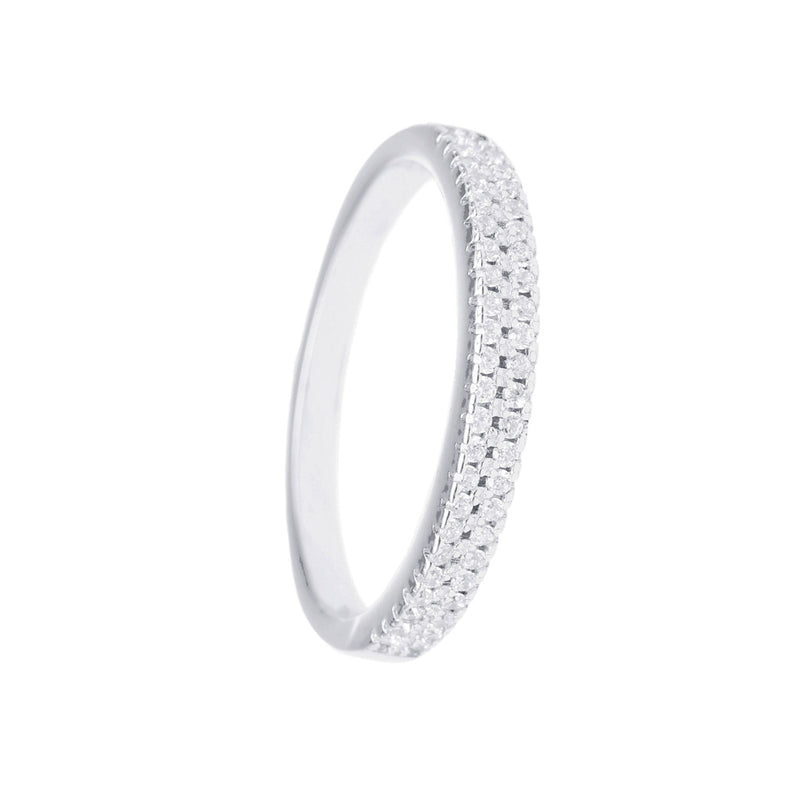Anel Meia Memória Dupla em Prata cravejada de Duas Fiadas de Zircónias – Duas Fiadas de Brilho com Elegância Redobrada
