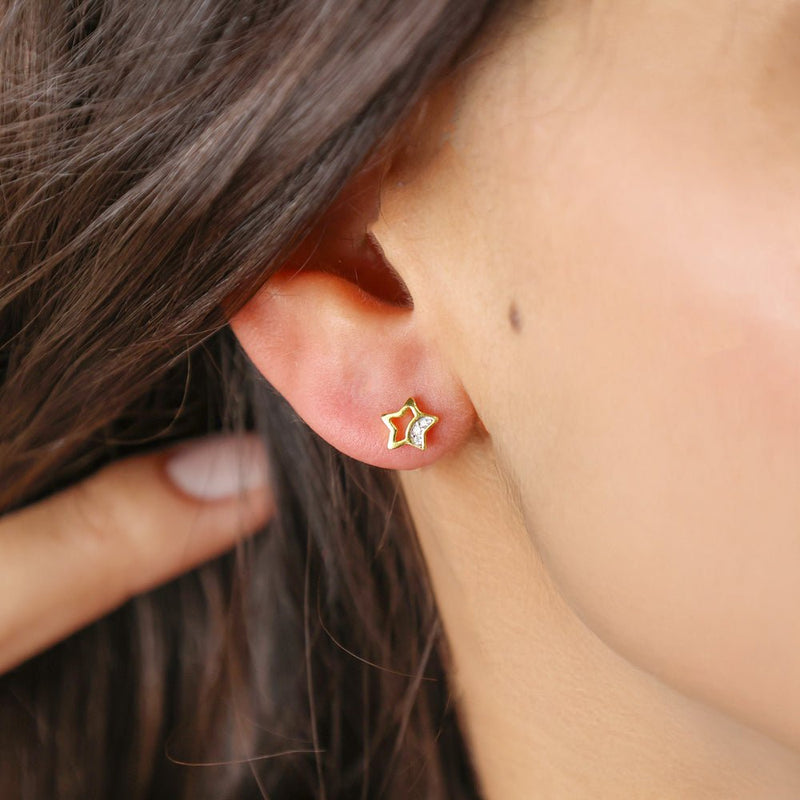 Brincos Estrela em Prata Dourada com Lua de zircónias
