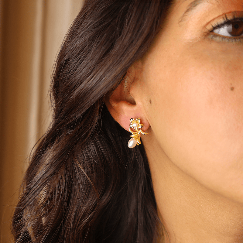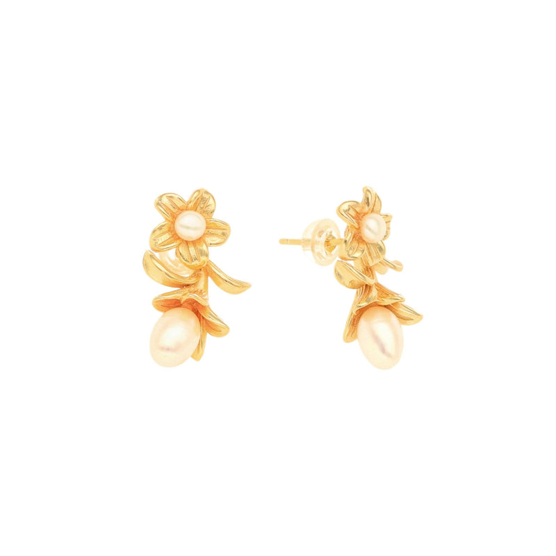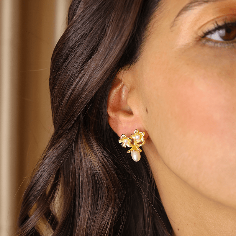 Brincos Florais em Prata Dourada 925 com Pérolas