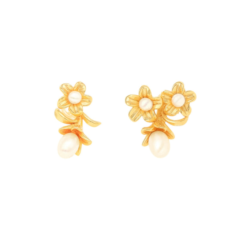 Delicadamente esculpidos, estes brincos em prata dourada capturam a beleza da assimetria com um toque poético e sofisticado. Cada brinco tem um design único, como se a natureza os tivesse moldado livremente, adornando-se com pequenas flores douradas que abrigam pérolas luminosas no seu centro.