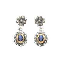 Brincos Vintage em Prata 925 com Motivos Florais, adornados de Pedra Azul Escura e marcassites. Detalhes em ouro 9Kt.