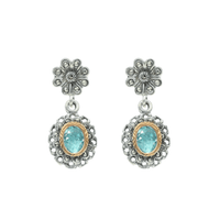 Brincos Vintage em Prata 925 com Motivos Florais, adornados de Pedra Azul Clara e marcassites. Detalhes em ouro 9Kt.