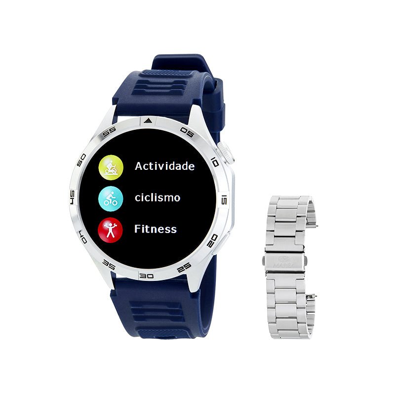 Com uma caixa de aço inoxidável de 44mm e um visor digital preto, o Logic oferece um visual sofisticado e versátil. Acompanha duas opções de bracelete – uma em aço inoxidável e outra em silicone azul, permitindo que alterne entre um estilo clássico ou desportivo. O fecho dobrável e de fivela garante um ajuste seguro e confortável.