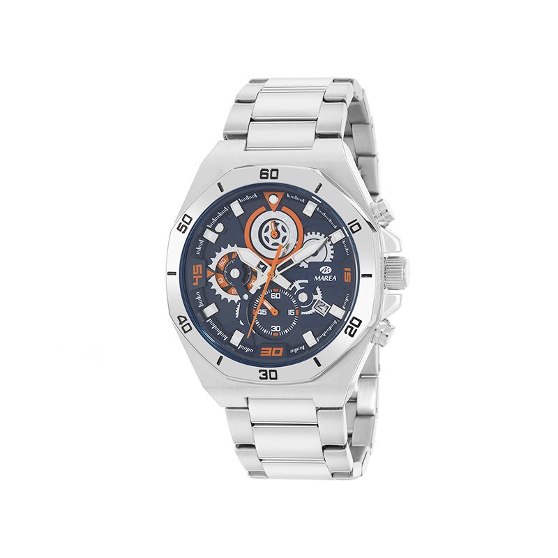 Com um diâmetro de 43mm, o mostrador azul escuro transmite elegância e profundidade, enquanto os detalhes em laranja adicionam um toque desportivo e dinâmico. A bracelete em aço inoxidável oferece resistência e conforto, e o movimento de quartzo garante precisão absoluta para o dia a dia.