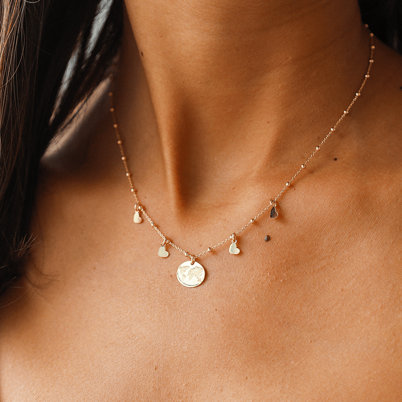Gold-plated silver necklace adorned with a World and Hearts pendant