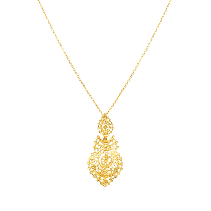 The Rainha Necklace in Gold-Tone Silver is an expression of timeless elegance and grace. The 925 gold-plated silver gives the necklace a sophisticated shine, while the stylized design evokes a sense of nobility and unique beauty.