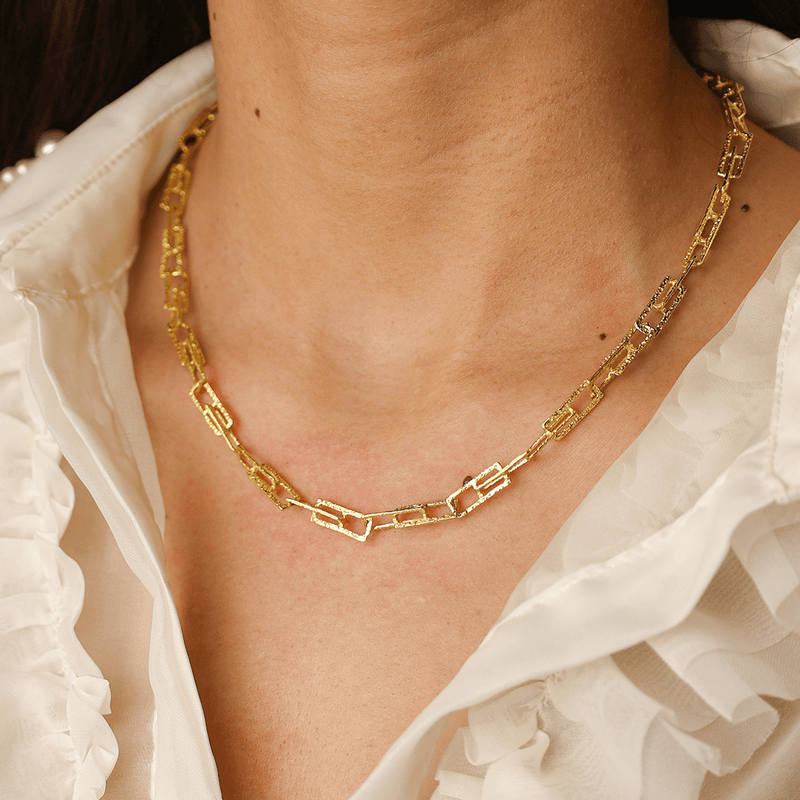 The 19K gold hammered chain choker is the perfect combination of elegance and exclusivity. Its hammered finish lends a distinctive shine, reflecting light in a sophisticated way and highlighting the richness of pure gold. A versatile and timeless accessory, ideal for those seeking a touch of luxury for any occasion.