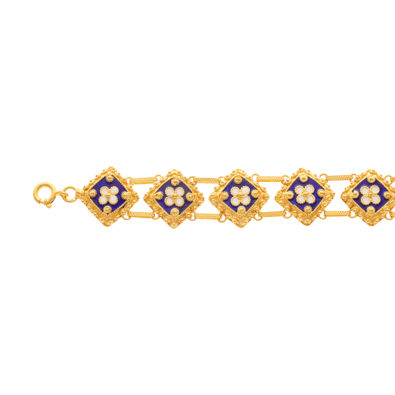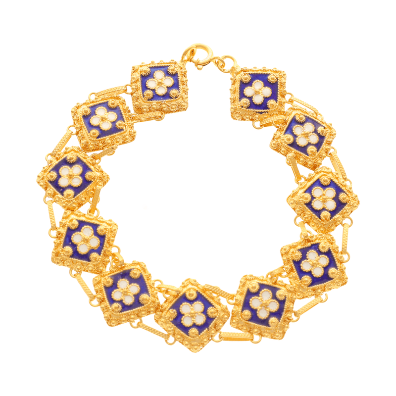 Refinement and elegance. Two words that best describe this 19-karat gold bracelet. Inspired by the Portuguese tile tradition, this gold bracelet is part of the "Tradition" collection, which combines the art of filigree with the tradition of snails. Floral motifs in white and blue enamel also add a touch of elegance and sophistication. If you enjoy sophisticated and timeless gold jewelry, this is undoubtedly the perfect choice.