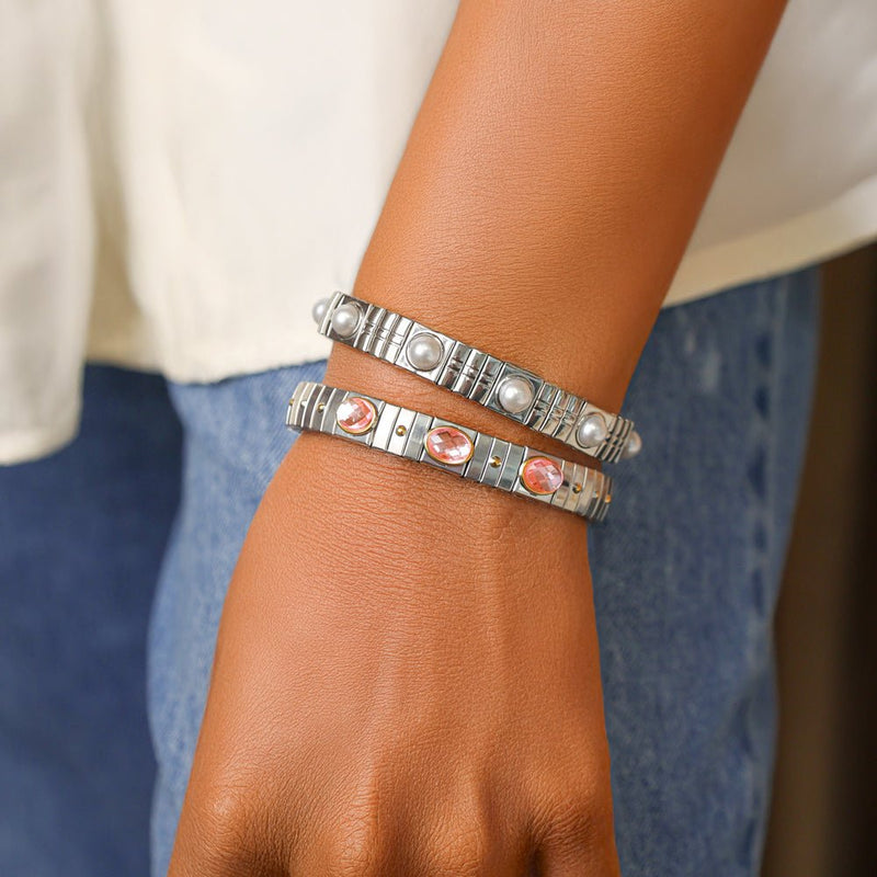 Be enchanted by the classic beauty of this sophisticated Stainless steel bracelet designed for those seeking a refined and timeless style. This unique accessory is adorned with elegant pearls, providing a perfect contrast between the softness of the pearls and the shine of the steel.