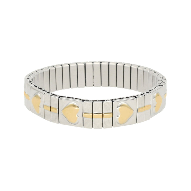 With a charming design and rich in symbolism, this silver-tone stainless steel bracelet features golden hearts interconnected by a delicate gold line. The combination of metallic tones creates a modern and elegant contrast, perfect for those seeking a versatile piece full of meaning.