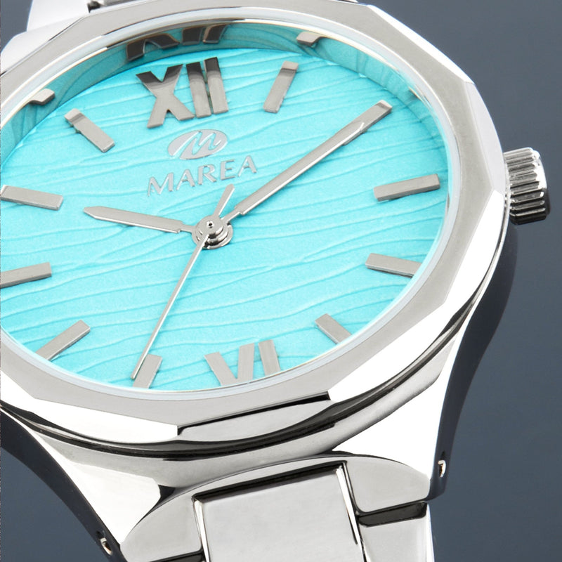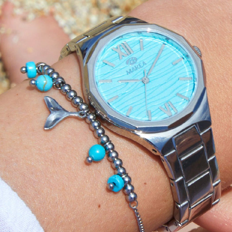 Inspired by the ethereal beauty of the Northern Lights , the Aurora Women's Watch stands out for its vibrant turquoise dial , evoking the magic of dancing lights in the sky. With a delicate and sophisticated 33mm design , this model is the perfect combination of refinement and modernity .