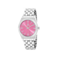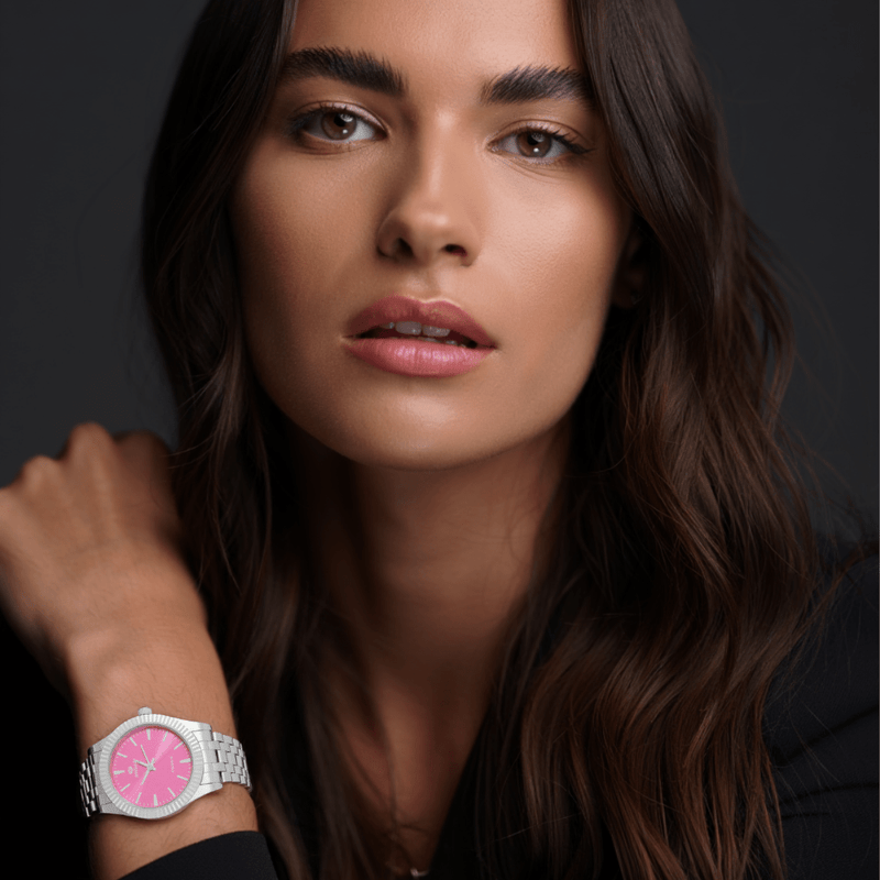 Its 38mm display offers a strong presence on the wrist, ideal for women who enjoy accessories with personality. The stainless steel bracelet combines durability and sophistication, ensuring comfort for daily use and resistance to wear.