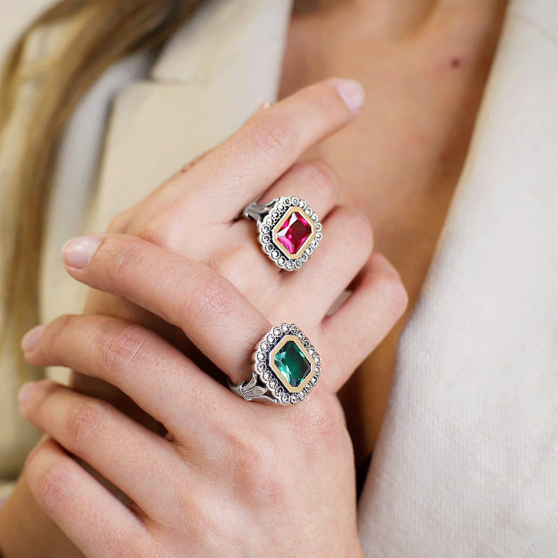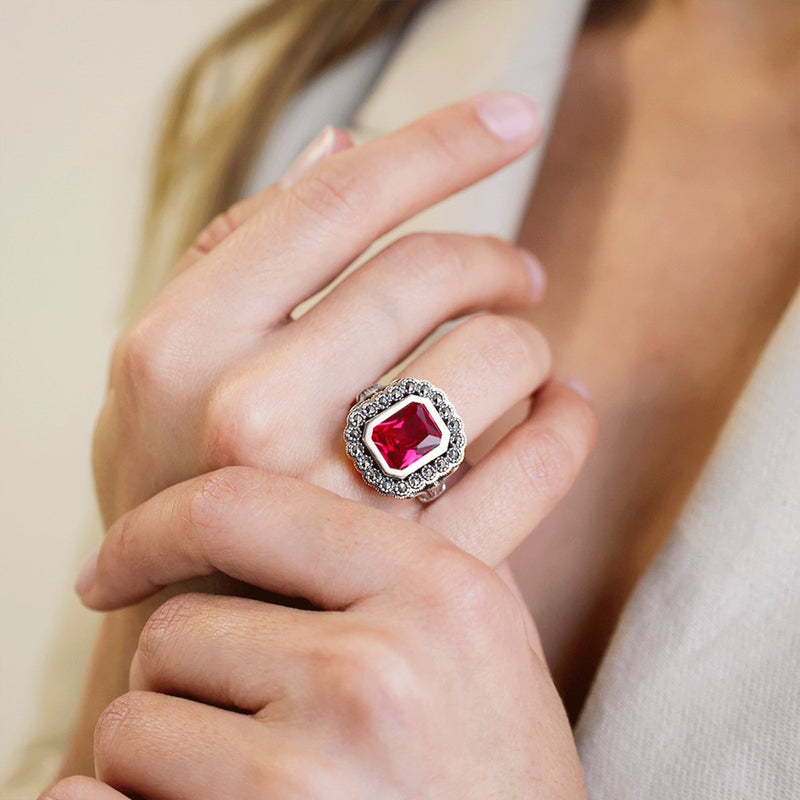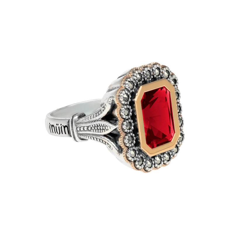 Anillo D. Constança en Plata y Oro 9k con Marcasitas y Piedra Roja