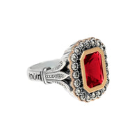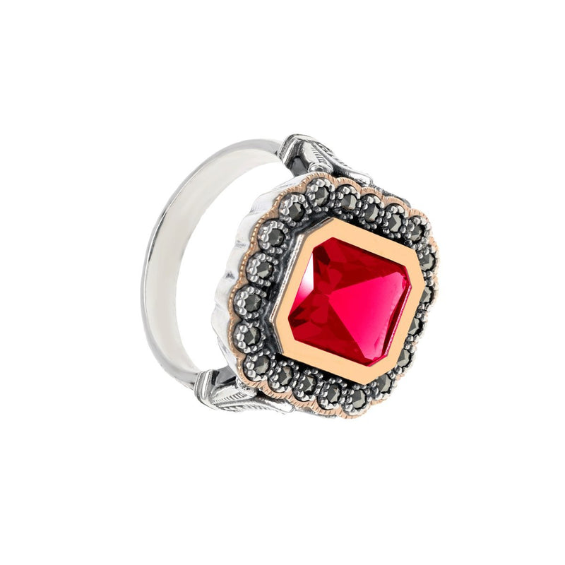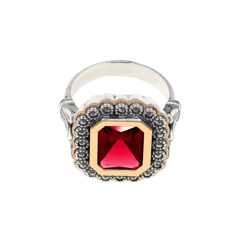 Anillo D. Constança en Plata 925 adornado con Piedra Roja flanqueada por Marcasitas y detalles en Oro 9k