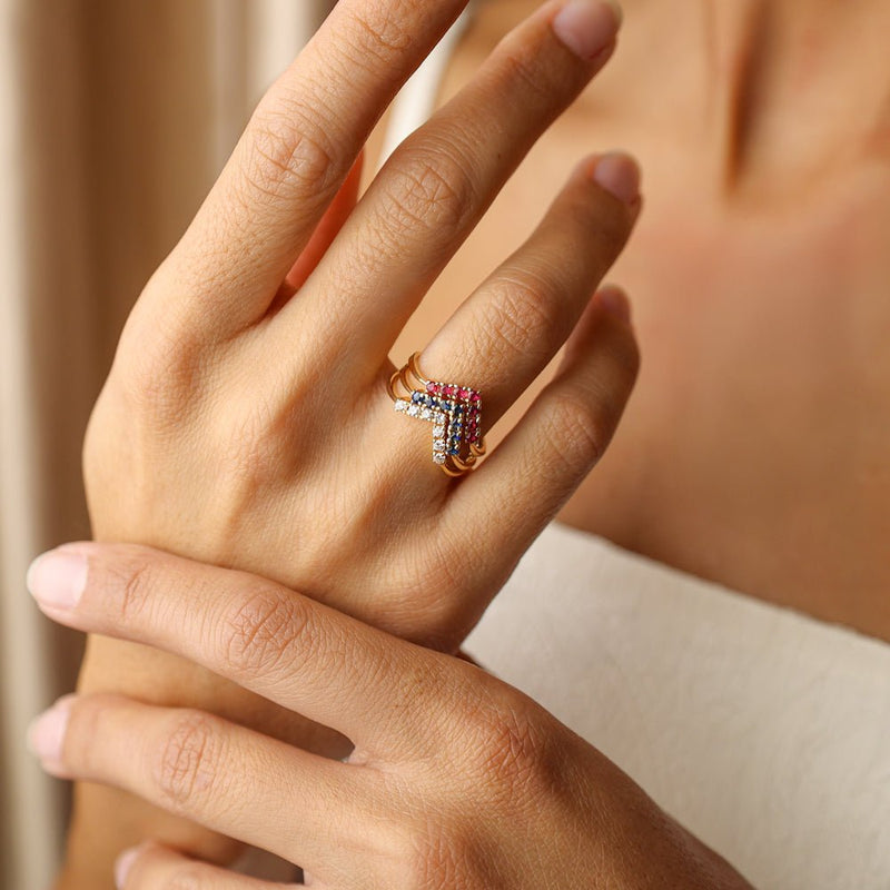 Delicado y majestuoso, el anillo de tiara de zafiro en oro de 19 quilates es una joya que combina simbolismo y sofisticación. Su diseño, inspirado en las coronas reales, está enriquecido con zafiros azules , piedras preciosas asociadas con la sabiduría, la lealtad y la serenidad. Cada zafiro está meticulosamente engastado, formando la silueta de una tiara que parece coronar el dedo con brillo y elegancia.