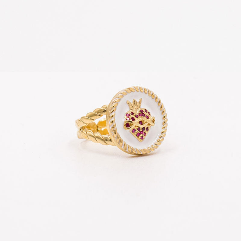 Anillo en Plata de Ley (925) y Esmalte, adornado con un Corazón Vaticano tachonado de Circonitas de Color Rubí.
