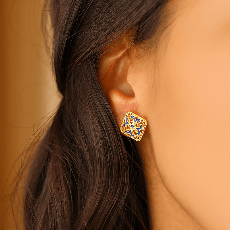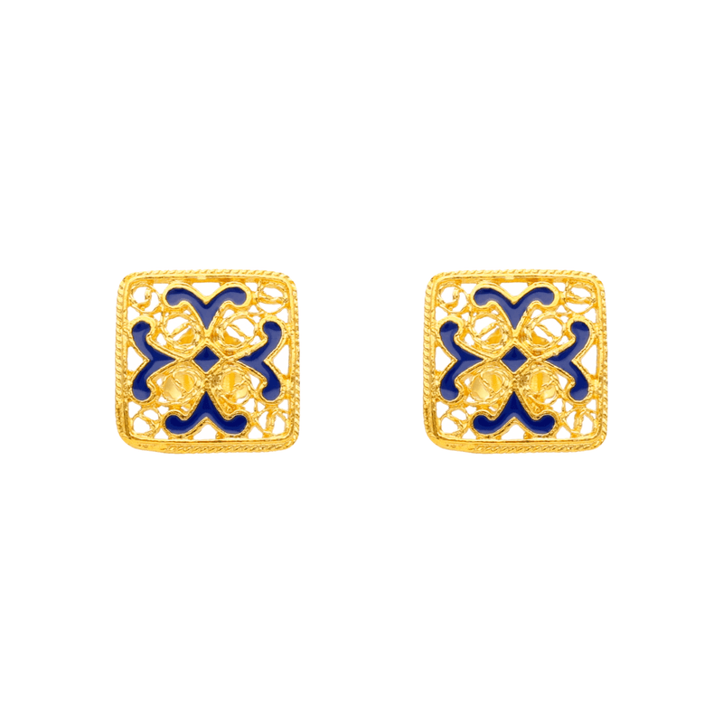 Su filigrana revela maestría artesanal y aporta ligereza y sofisticación a la pieza, mientras que los detalles de esmalte azul refuerzan su carácter artístico y cultural. Discretos pero con personalidad, son ideales para quienes valoran la joyería con historia, elegancia e identidad .