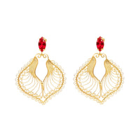 La filigrana de oro añade delicadeza y elegancia a los pendientes, creando un aura de lujo sutil. En el centro de cada arpa, una brillante piedra roja está cuidadosamente engastada, aportando un toque de color vibrante y pasión al conjunto.