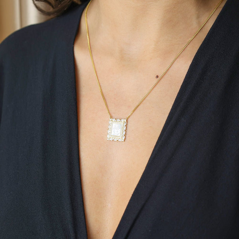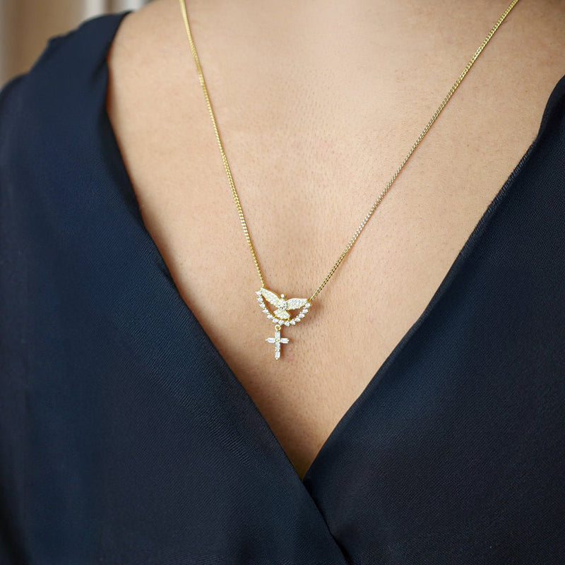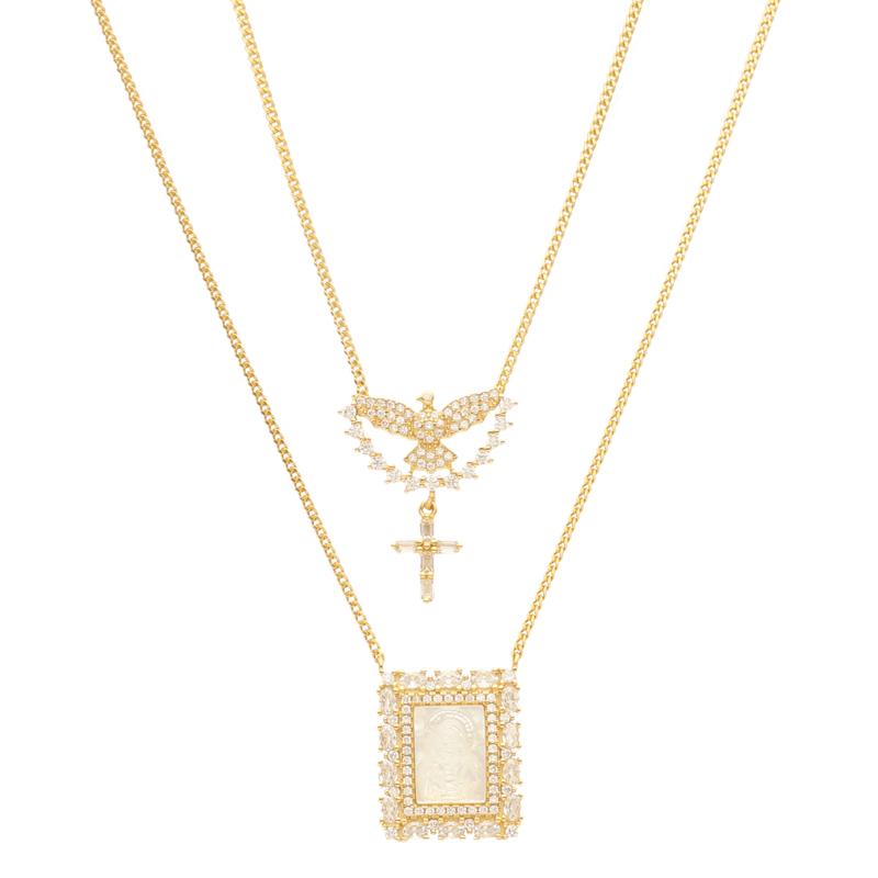 Este escapulario de plata dorada es un poderoso símbolo de devoción y protección espiritual. La imagen religiosa de nácar refleja la luz de la fe, mientras que la paloma representa al Espíritu Santo y la paz divina, trayendo consigo la presencia de la protección celestial. La cruz, símbolo supremo del amor y la redención, completa esta joya sagrada, reforzando la conexión con lo sagrado.