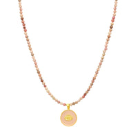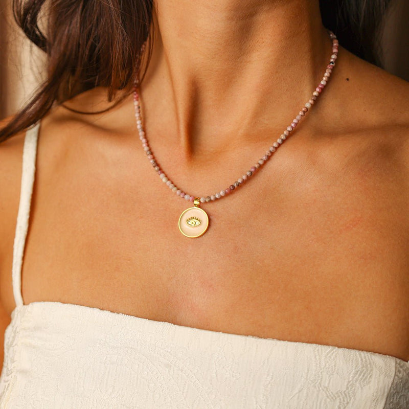 Collar Indie en Plata Dorada con Cuentas Rosas y Ojo Turco (40 cm)