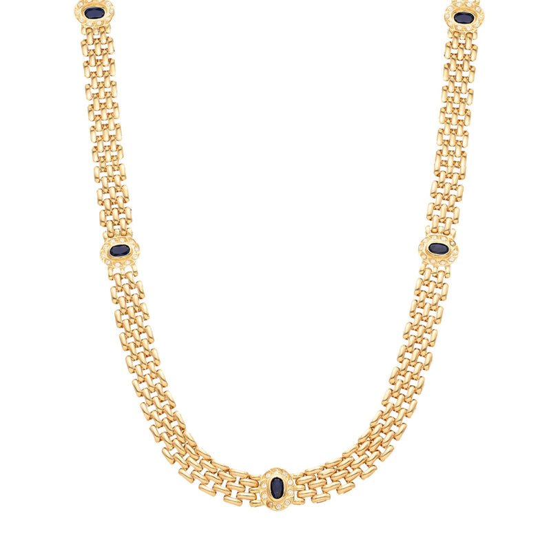 La gargantilla de oro de 19 quilates con zafiros y circonitas es una joya de singular belleza y elegancia. El encantador brillo de los zafiros se funde armoniosamente con el esplendor de las circonitas , creando un diseño sofisticado y atemporal que realza el encanto de quien la luce.