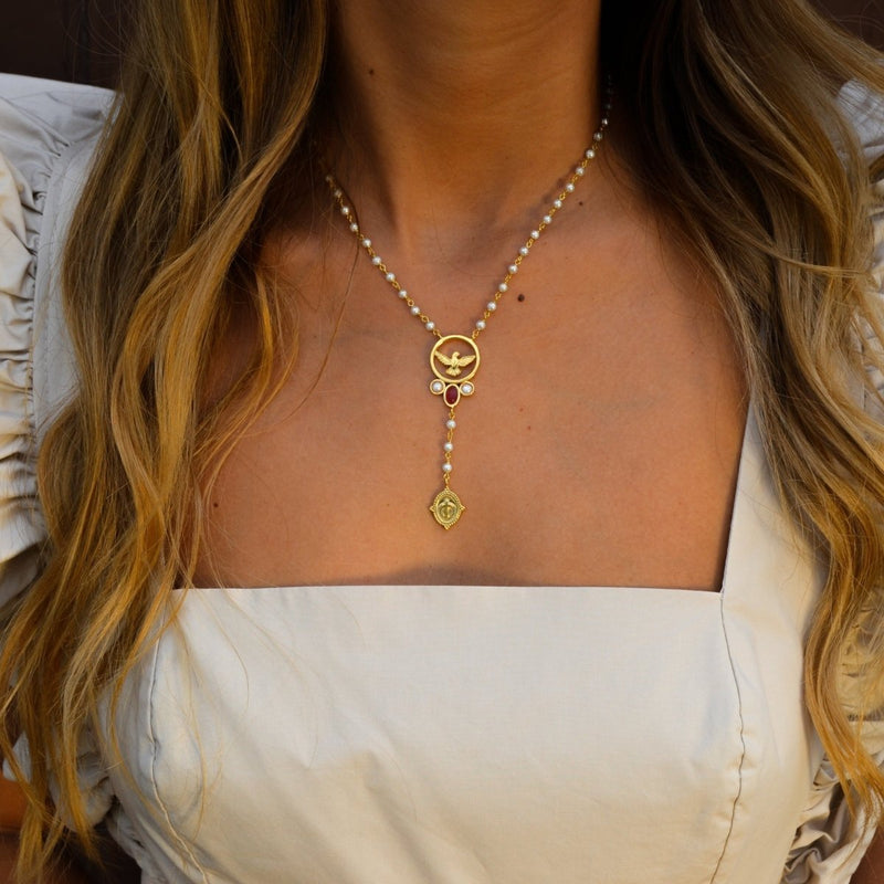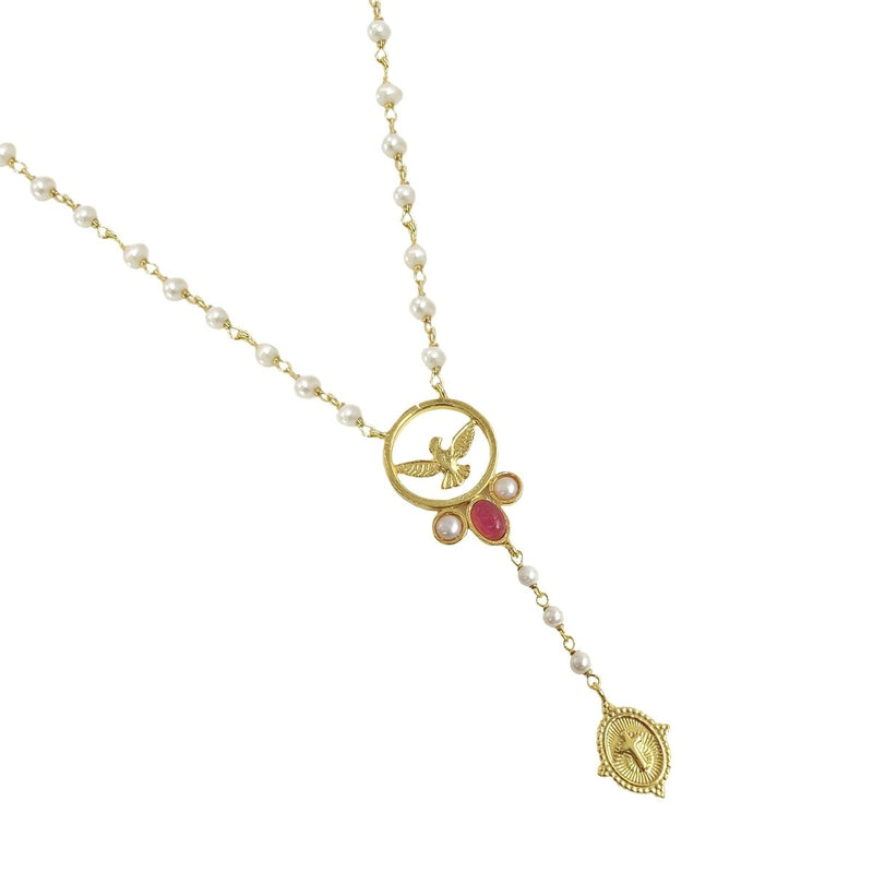 Collar de Plata bañado en Oro con Perlas, adornado con Medalla Paloma y Piedra Turquesa
