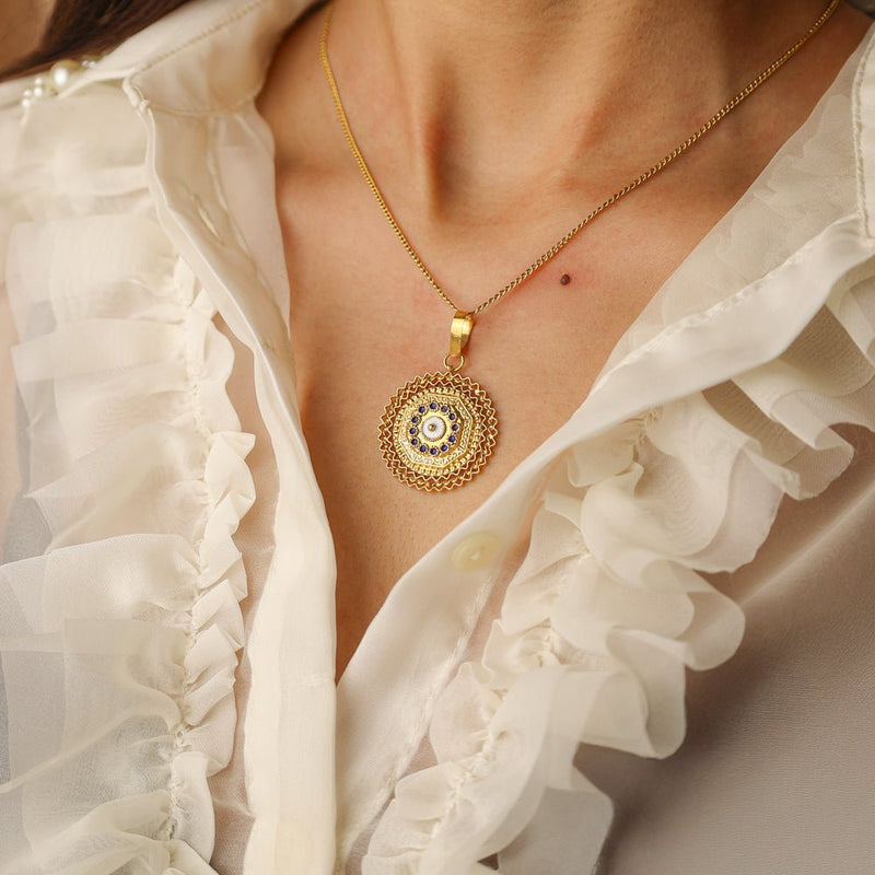 La medalla de encaje de oro y esmalte es una pieza impresionante que combina la delicadeza del trabajo minucioso con la riqueza de los colores del esmalte. Su meticuloso diseño evoca la alta joyería, creando un accesorio único, elegante y con personalidad.